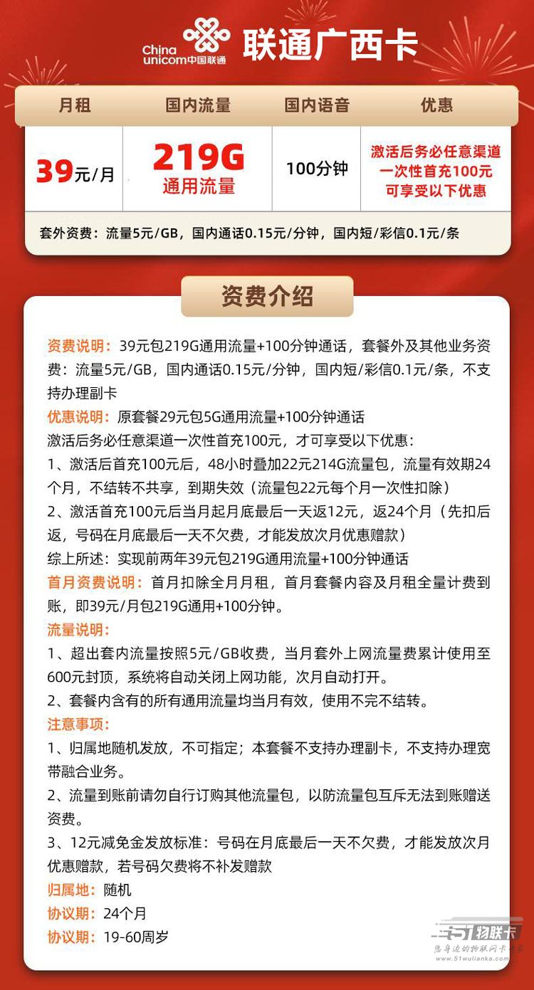 (仅发广西)联通广西卡 39元包219G通用流量+100分钟通话