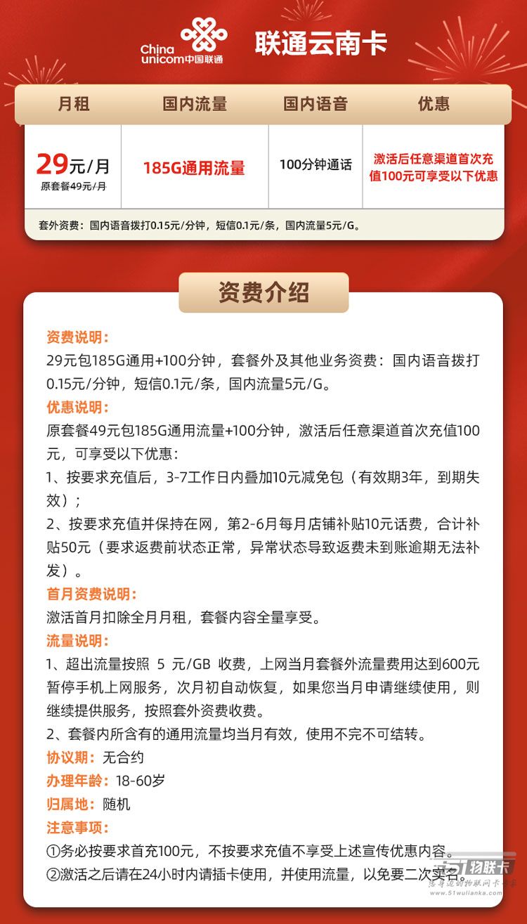联通云南卡 29元包185G通用+100分钟(仅发云南)
