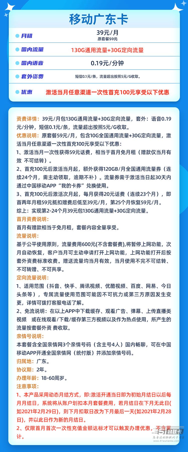 移动广东卡 39元/月包130G通用流量+30G定向流量(只发广东)