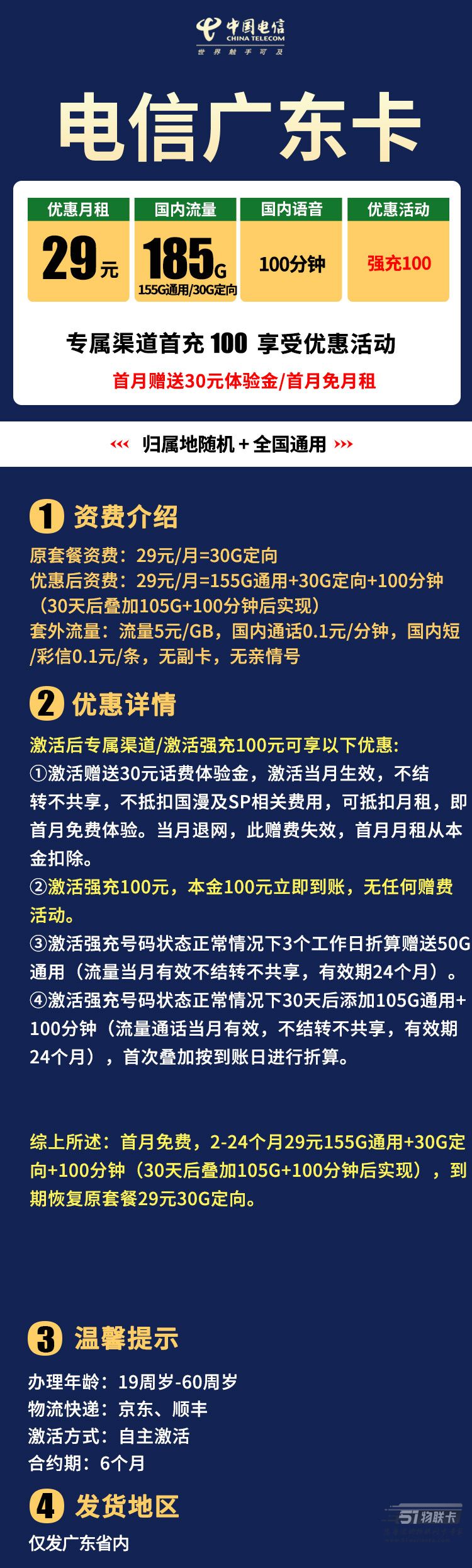 电信广东卡 29元185G流量+100分钟 自主激活 只发广东