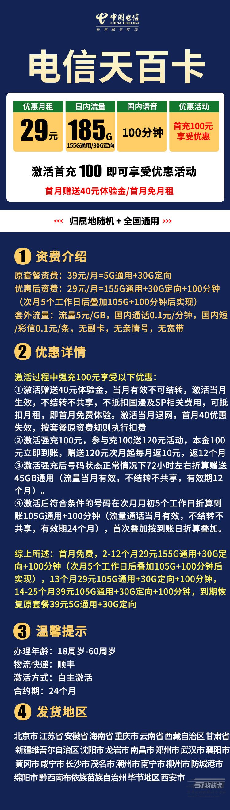 电信天百卡 29元185G流量+100分钟 全国可发【自主激活】