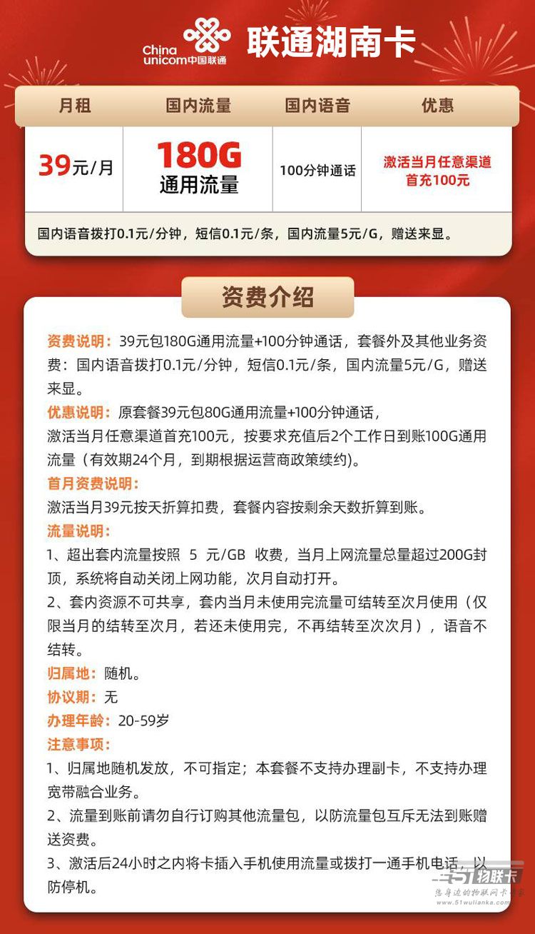 联通湖南卡 39元包180G通用+100分钟通话(仅发湖南)