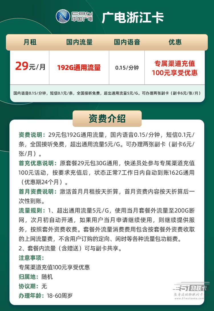 广电浙江卡 29元192G通用流量(仅发浙江)