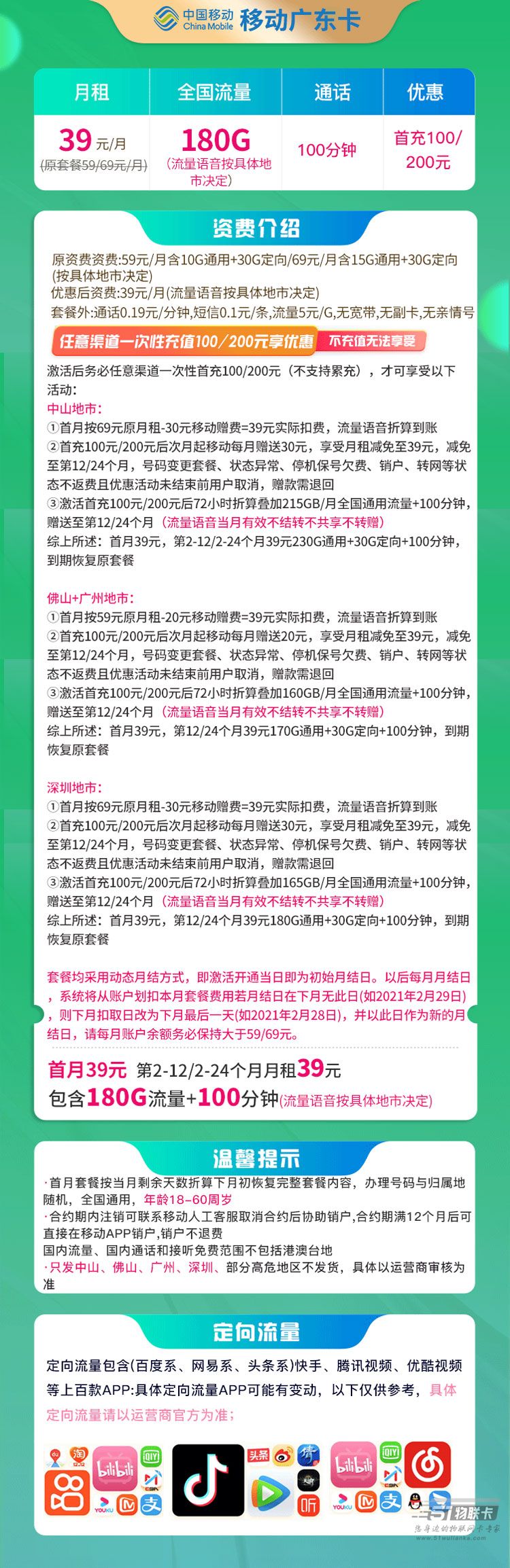 移动广东卡 39元180G流量+100分钟 只发广东