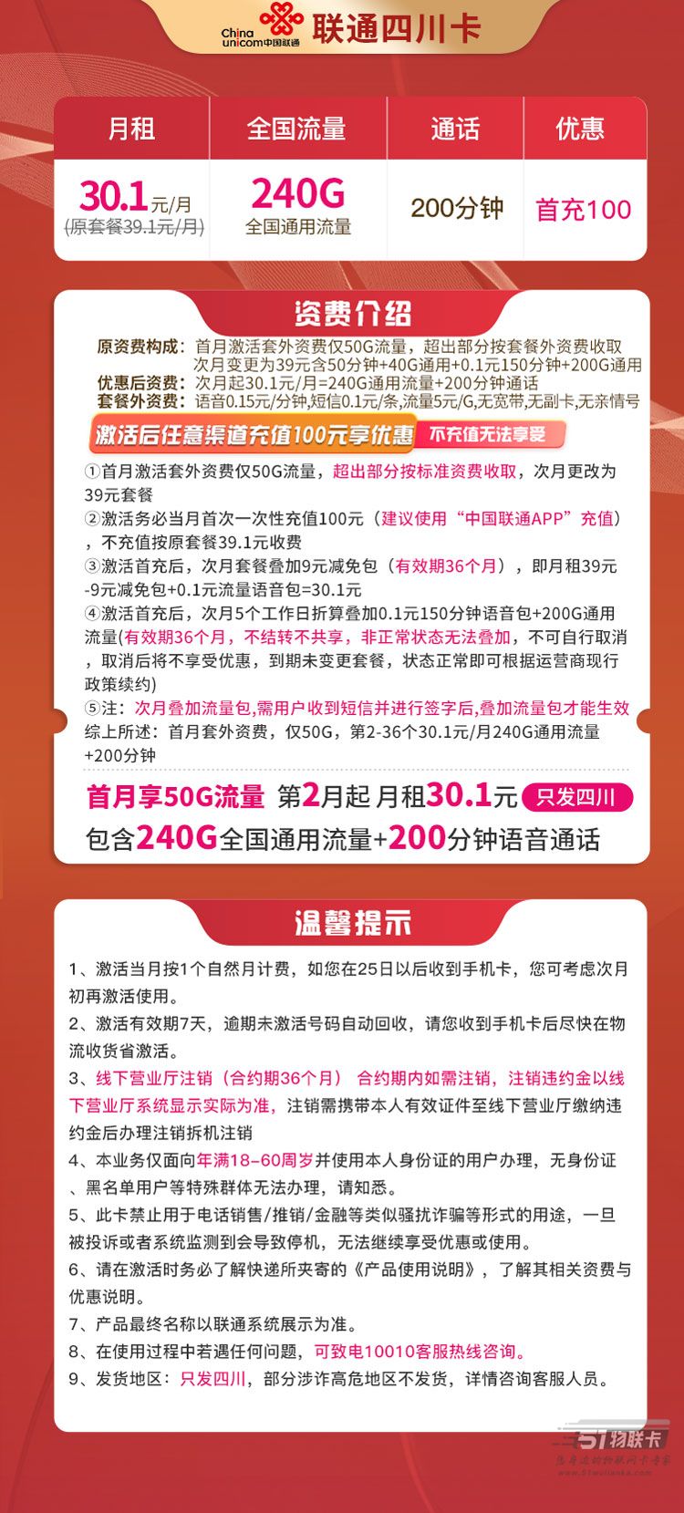 联通四川卡 30.1元230G通用+200分钟 只发四川