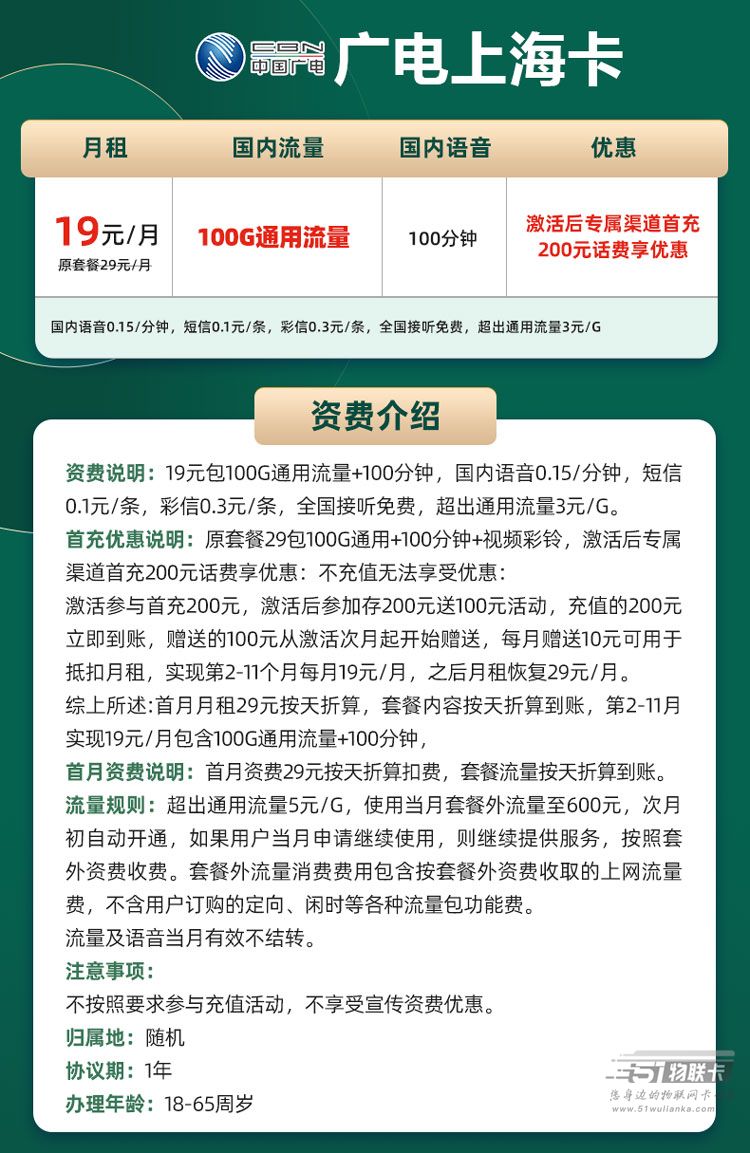广电上海卡 19元100G通用流量+100分钟通话(仅发上海)