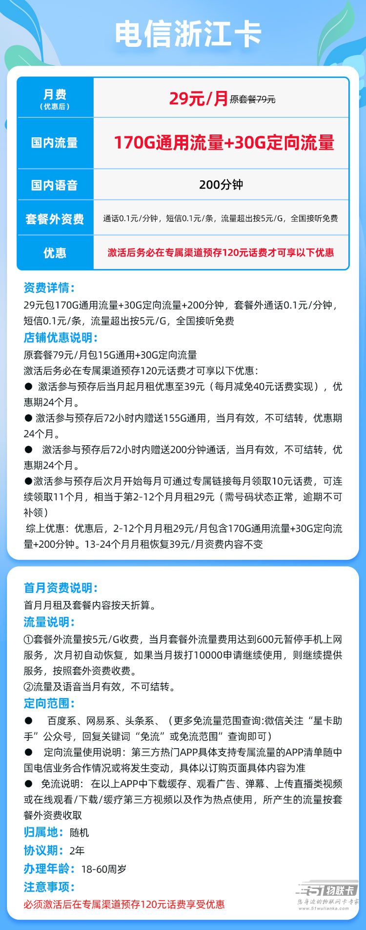 电信浙江卡 29元包170G通用流量+30G定向流量+200分钟 只发浙江