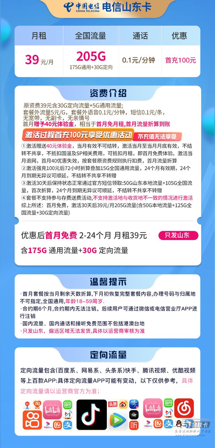 电信山东卡 39元205G流量 首月免费 只发山东
