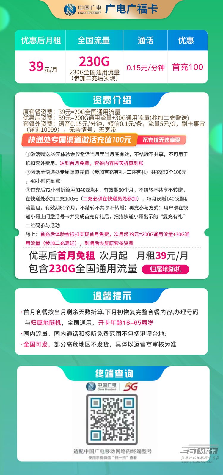 广电广福卡 39元230G全国通用流量【首月免费】 全国可发