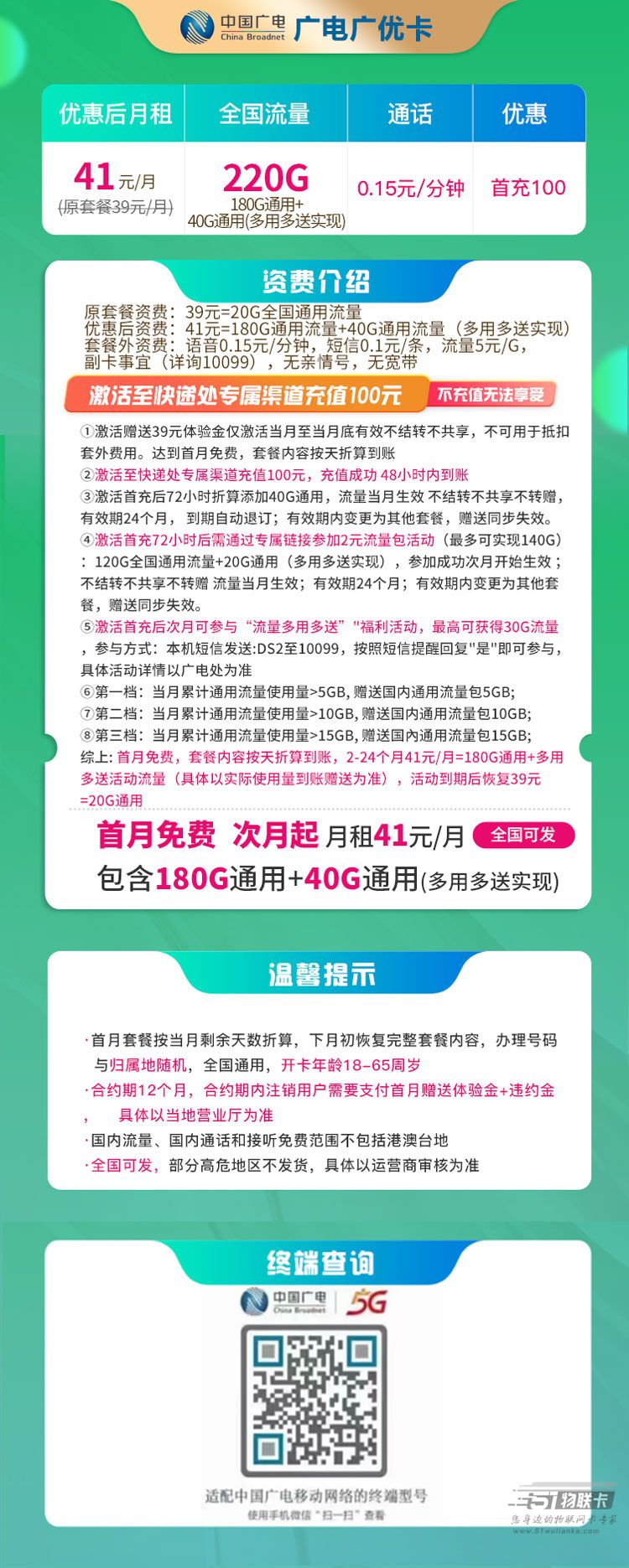 广电广优卡 41元220G通用流量 全国可发 首月免费