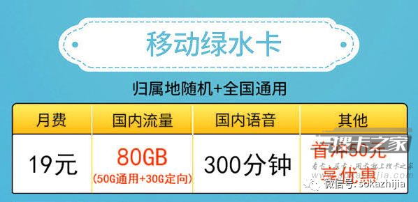 这款移动绿水卡资费月租为19元/月,该套餐还拥有80G的全国流量(50G通用+30G定向)和300分钟通话,不管是想要低价大流量的朋友,还是经常打电话的朋友,这款新套餐都满足了你的需求。