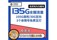 移动月亮卡 29元 135G全国流量+3个亲情号【收货地为归属地】