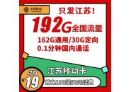 只发江苏省:江苏本地移动卡19元月租162G通用流量+30G定向流量...